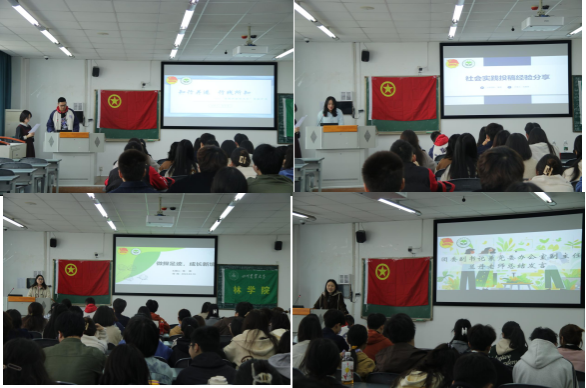 讨论会上,“‘杉’情予你”社会实践团队负责人李洪非从什么是社会实践,怎么开展社会实践,通过社会实践能收获什么,多方面分享其在社会实践中总结的经验。重点说明了社会实践中需要选择适合自己的社会实践,并认真负责地做好每一次的服务与工作。“臻境”社会实践团队负责人刘霏扬从社会实践如何宣传等方面为同学们给予帮助,提供了诸多在社会实践中关于如何投稿,如何扩大宣传力度,如何提高影响力的方法和技巧。“双碳号角”暑假科普宣传队负责人陈素通过整体团队介绍和社会实践中遇到的具体困难及解决措施,实践成果等方面,详细具体地向大家展示社会实践全流程。使同学们直观的感受到社会实践的具体操作方式以及实践流程,避免同学们在之后的社会实践中可能出现的实践流程不规范,实践材料准备不充。