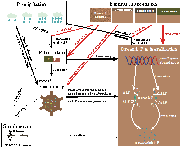 生物土壤结皮(生物结皮)是干旱生态系统中至关重要的组成部分,然而,与碳、氮循环相比,其在影响土壤磷转化过程及相关功能微生物群落方面受到的科学关注较少。本研究在我国北方进行了生物地理学考察,研究了降雨、生物结皮演替及灌丛遮盖在土壤有机磷矿化过程中的作用。结果发现,磷矿化参数(包括土壤C:P、土壤有机磷含量、生物可用磷含量、phoD基因丰度以及碱性磷酸酶活性)随着生物结皮演替而增加,且其对降雨量的响应因生物结皮演替阶段而异;此外,灌丛遮盖与否对其影响较小。大多数磷矿化参数在单个沙漠内或所有研究的沙漠之间呈正相关,表明磷限制驱动土壤phoD基因丰度、磷酸酶活性及有效磷含量。土壤phoD微生物群落的β多样性主导有机磷矿化。一些相对丰度较低的属(Actinoplanes和Micromonospora)与磷矿化参数显著正相关。通过突显生物结皮演替作为土壤有机磷矿化的关键决定因素,降水和生物结皮演替对phoD群落的显著影响,以及phoD β多样性主导土壤有机磷矿化,本研究为了解生物结皮系统中有机磷向可生物利用的磷转化的微生物机制提供了新的见解(图1)。