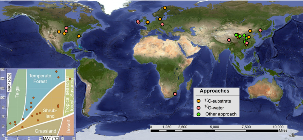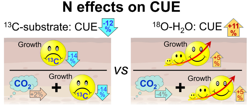 土壤微生物碳利用效率表示微生物同化、吸收以及转移碳的能力,是反映土壤微生物介导和调控短期碳循环的关键参数。较高的土壤微生物碳利用效率反映了微生物将枯落物或根沉积物转化为微生物生物量的高效率,这可能有利于提高土壤碳固存的潜力;而较低的碳利用效率则意味着大量的碳通过微生物的呼吸作用释放到大气中,进而可能减少土壤碳储量。由于碳氮循环的相互作用,且氮的可利用性会影响微生物的代谢活动。在全球人为氮输入不断增加的背景下,土壤氮含量的增加可能会改变微生物碳利用效率进而影响全球碳循环。目前大多数研究多采用碳13标记有机物和氧18标记水的同位素示踪法来估算土壤微生物的碳利用效率,但基于这些方法的估算值往往存在较大差异,进而会导致不同估算方法下土壤微生物碳利用效率对氮添加响应的差异。