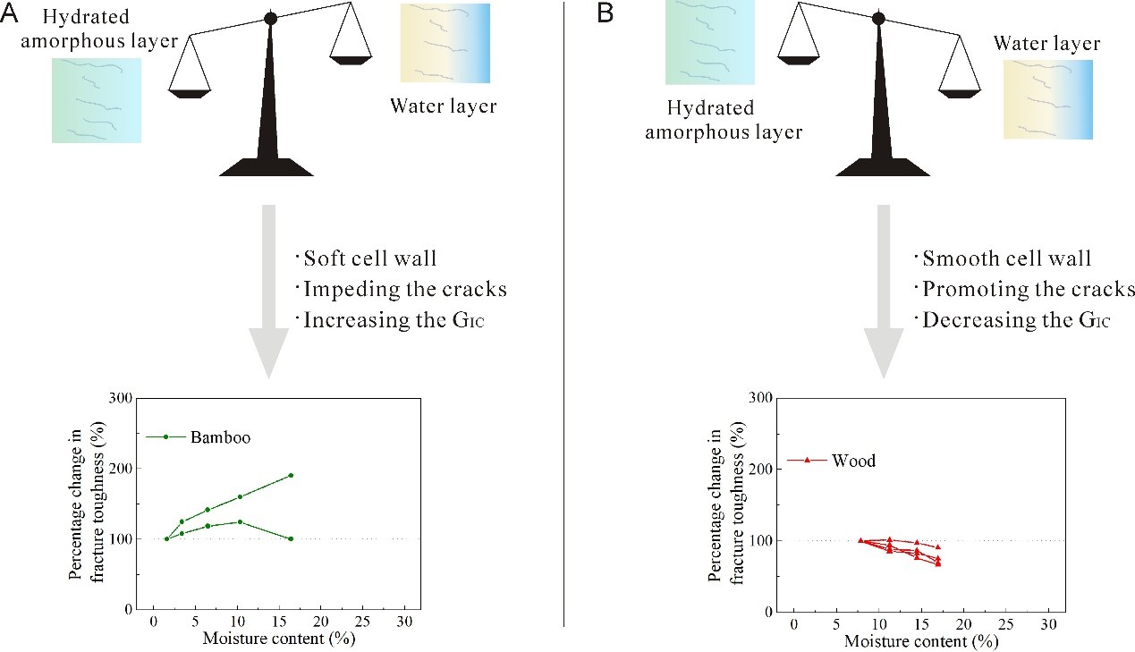 研究中,作者考察了几种典型的含水率对竹材断裂韧性的影响,发现水分的作用同时包括了促进和阻止竹材中裂纹的扩展。竹材吸湿后,细胞壁变软,竹材塑性增大,阻碍了裂纹的扩展;但是细胞壁表面形成水层,界面摩擦力减小,反而促进了裂纹的扩展。前者的作用效果更强,因此竹子的断裂韧性随含水率的增加而增加。这种源于水分的竞争机制也被发现适用于解释其他材料的断裂特性,如木材、石头和粘土等。