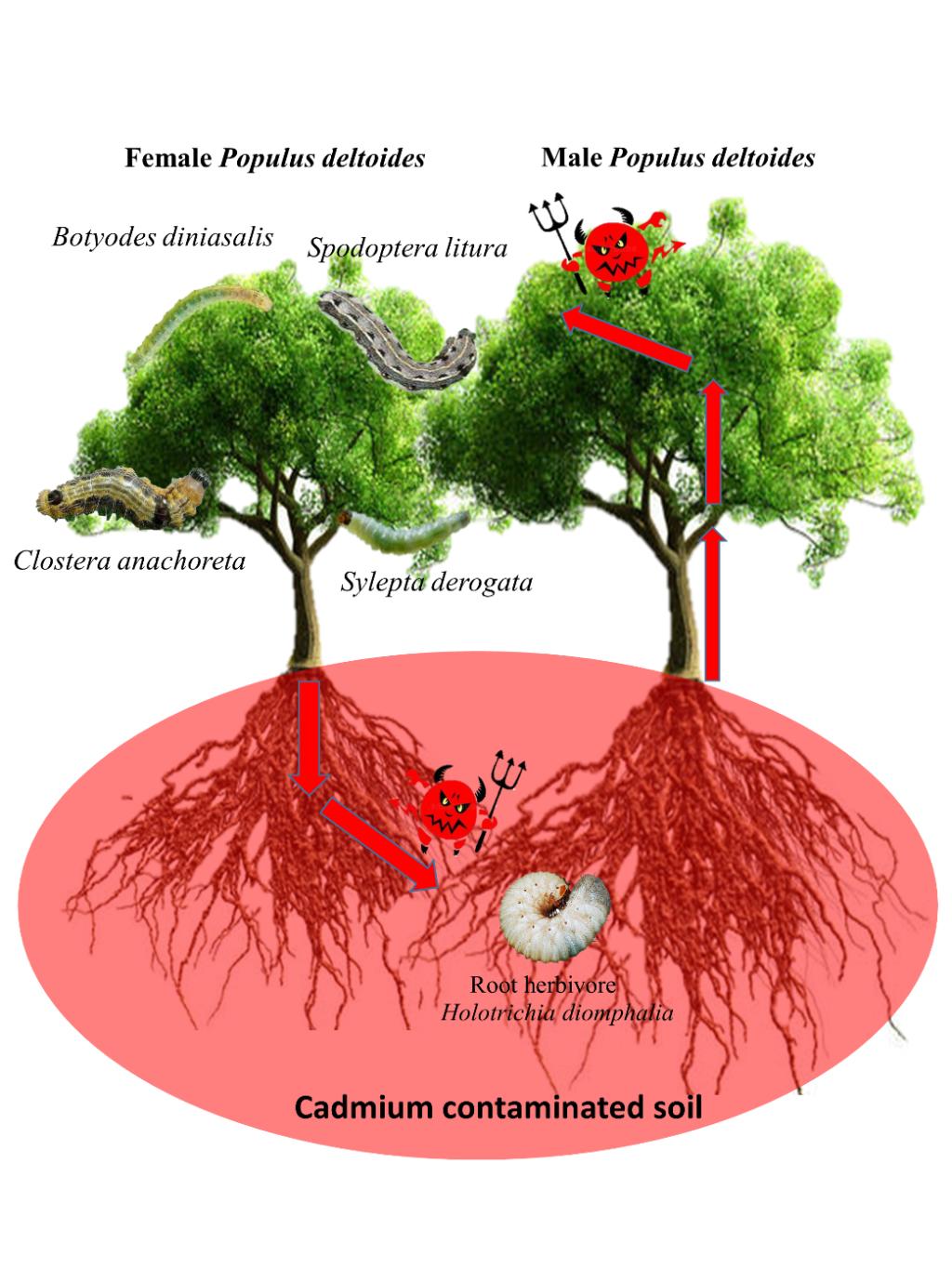 元素防御假说认为重金属被植物吸收并富集在体内后可以在一定程度上增强植株的抗虫性。但是对于林木等重金属低富集植物来说,过量的重金属富集可以反过来对植株的生长发育产生毒害作用。因此,如何在不影响植物生长发育的前提下,利用重金属在其体内的富集来增强植物的抗虫性成为了当前该假说在应用上亟待解决的问题,而选择对重金属具较高耐受性和富集能力的植物性别是解决该问题的方法之一。前期有学者在研究重金属对低富集木本植物生长发育的影响中发现,同种木本植物不同性别的植株对重金属的耐受程度和富集系数具有明显的差异性。而该性别差异是否会导致雌雄植株的抗虫性出现差异尚未见报到。在综合元素防御假说和雌雄植株对重金属胁迫的耐受性差异的基础上,该课题组首次提出在重金属胁迫下同种木本植物雌雄植株间抗虫性会出现显著差异,且雄性植株抗虫性更强这一假说。