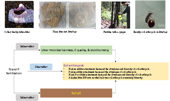 氮沉降引起的生态系统氮/磷比值的升高正以前所未有的速度改变着陆地生态系统凋落叶分解和生物多样性。土壤节肢动物对土壤养分敏感,因此氮和磷水平的波动可能会改变土壤节肢动物的群落结构和组成。然而,目前关于磷添加及其与氮的交互作用对森林凋落叶分解过程中土壤节肢动物影响的研究鲜有报道,其响应机理更是知之甚少。研究团队在华西雨屏区进行了野外凋落叶分解袋试验,研究了氮、磷添加对凋落叶分解过程中土壤节肢动物的影响。研究结果表明,磷添加通过改变凋落叶分解过程中MBC含量,纤维素和木质素浓度,土壤pH值以及凋落叶氮/磷比进而反转了氮添加对凋落叶分解过程中土壤节肢动物多样性的负面影响。不仅如此,凋落物氮/磷比与土壤节肢动物多样性呈负相关关系,且单独添加氮处理增加了凋落叶氮/磷比,这意味着如果未来大气氮沉降继续上升,凋落叶分解过程中土壤节肢动物多样性将减少。