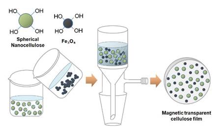 纳米纤维素的制备、利用是生物质资源高值利用领域的前沿热点,多数研究聚焦于棒状、纤维状纳米纤维素。球状纳米纤维素表面羟基密度更大,具有更加优异的可修饰性,但其制备一直是该领域的难点,鲜有研究。本论文作者在2019年取得突破性进展,首次采用环保、低成本的方法合成了球状纳米纤维素(Cellulose, 2019, 26: 5177)。本研究在2019年成果的基础上,以竹粉为原料,用改进的方法成功合成了球状竹材纳米纤维素,并利用其表面羟基提高了纤维素/Fe3O4磁性复合膜中Fe3O4纳米粒子的分散程度,从而提高了复合膜的透明度、磁性能。该研究成果为球状纳米纤维素的制备、应用提供思路与方法,拓宽了纤维素的应用范围,有利于推动球状纳米纤维素成为“第三大纳米纤维素产品”,促进竹材高值利用。