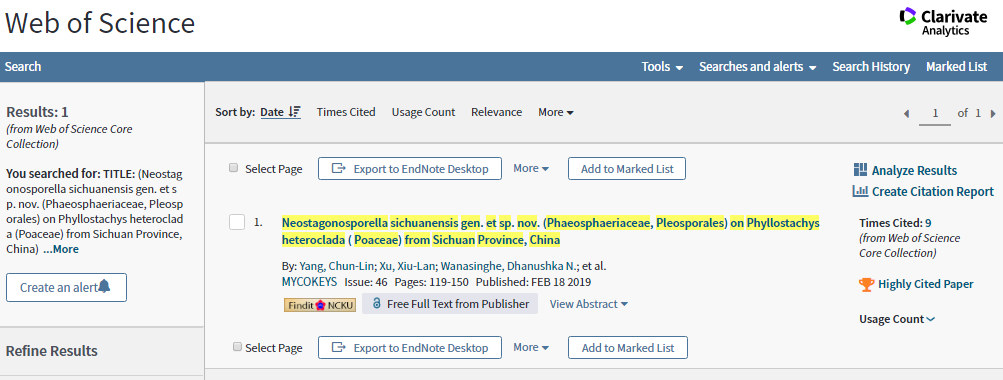 根据2020年4月ESI(Essential Science Indicators)最新数据显示,英国365上市公司杨春琳博士以第一作者、刘应高教授为通讯作者发表在《MycoKeys》上的1篇论文“Neostagonosporella sichuanensisgen. et sp. nov. (Phaeosphaeriaceae, Pleosporales) onPhyllostachys heteroclada(Poaceae) from Sichuan Province, China”入选全球Top 1% ESI高被引论文,以上成果实现了以公司为第一作者单位ESI高被引论文的零突破。本论文简要总结和评述了格孢腔菌目(Pleosporales)暗球腔菌科(Phaeosphaeriaceae)的研究进展,同时结合形态学和分子鉴别特征,对该科各属间的系统进化关系予以评价,并详细介绍该科下1新属,即拟小滴孢腔菌属(NeostagonosporellaC.L. Yang, X.L. Xu & K.D. Hyde)。