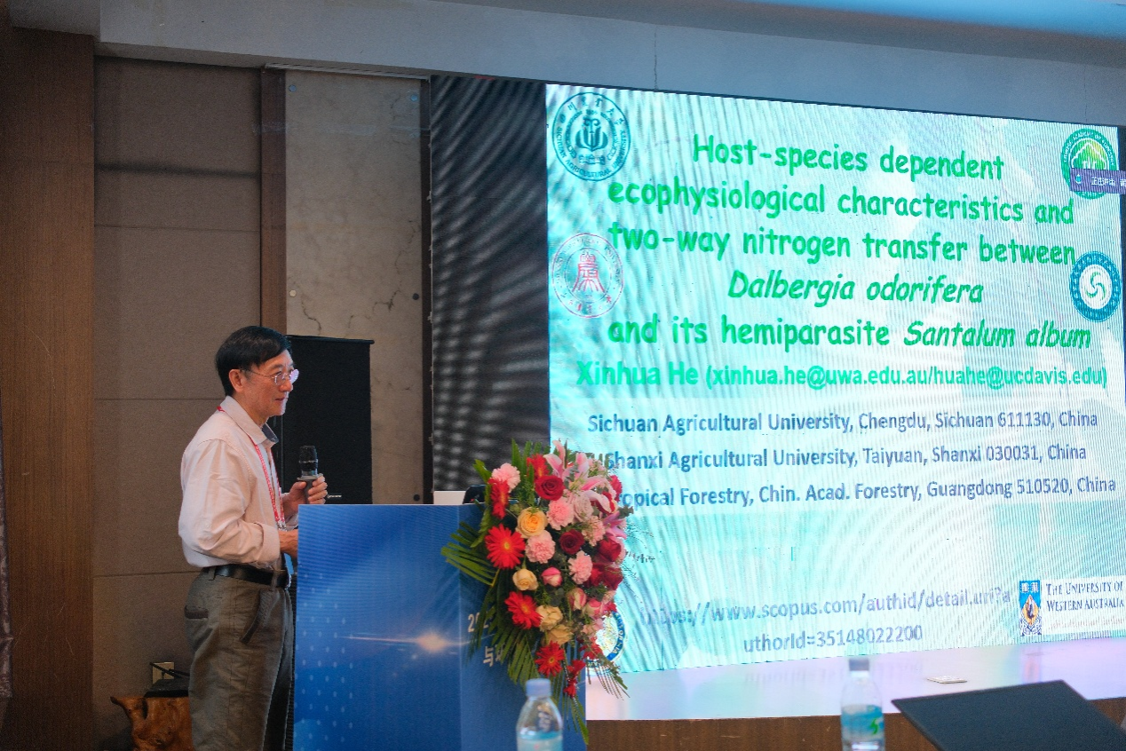 何新华教授作大会特邀报告,题为“Host-species dependent ecophysiological characteristics and two-way transfer of nitrogen betweenDalbergia odorifera and its hemiparasiteSantalum album”。同时,中国科公司西北生态环境资源研究院何志斌研究员、中国科公司西双版纳热带植物园张一平研究员、内蒙古农业大学张秋良教授、广东省科公司广州地理研究所周平研究员等受邀做了特邀报告分享了最新研究成果。