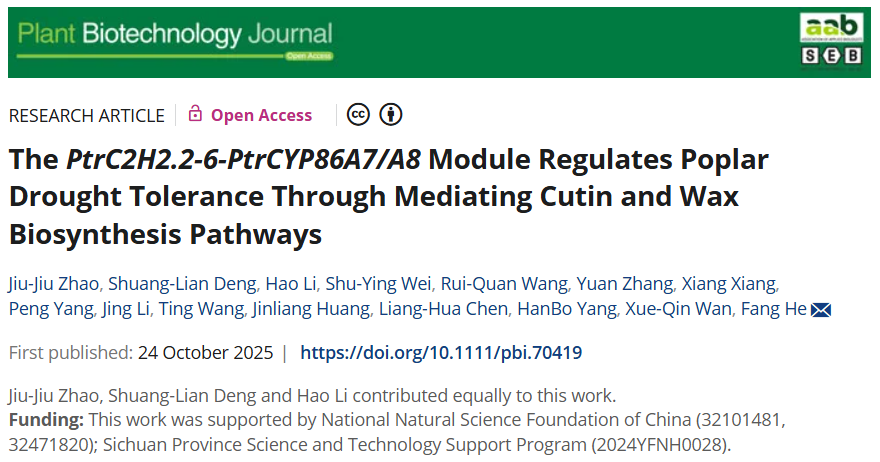 当杨树遭遇干旱时,它如何通过自身的"护肤系统"锁水保命?近日,公司林木遗传育种团队在植物学知名期刊《Plant Biotechnology Journal》(影响因子12.4)上发表了最新研究成果,揭示了杨树应对干旱胁迫的新型分子机制,为林木抗旱育种提供了重要的理论依据和基因资源。