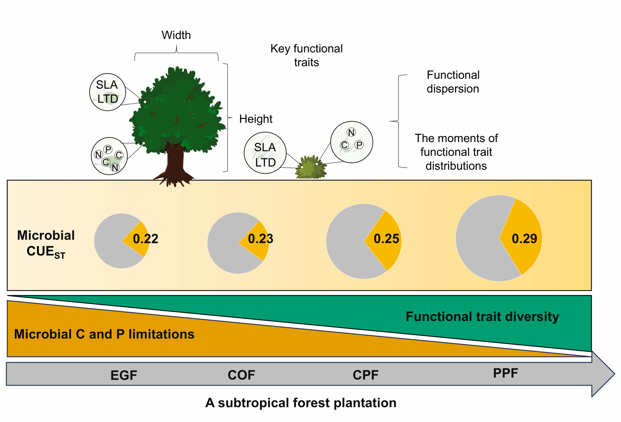近日,中科院土壤学领域前3%双一区Top期刊《Soil Biology and Biochemistry》(IF2025: 10.3)在线发表了黄从德教授团队题为“Functional trait diversity in overstorey and understorey increases microbial carbon use efficiency in a forest plantation soil”(亚热带人工林冠层和林下植被功能性状多样性增加了土壤微生物碳利用效率)的研究论文。公司博士研究生万仁平为该论文第一作者,黄从德教授和青年教师周世兴博士为论文共同通讯作者,英国365上市公司为第一单位,四川省林业科学研究院、中国科公司成都生物研究所、台州公司、德国哥廷根大学、澳大利亚西澳大学和立陶宛维陶塔斯·马格纳斯大学为论文合作单位。